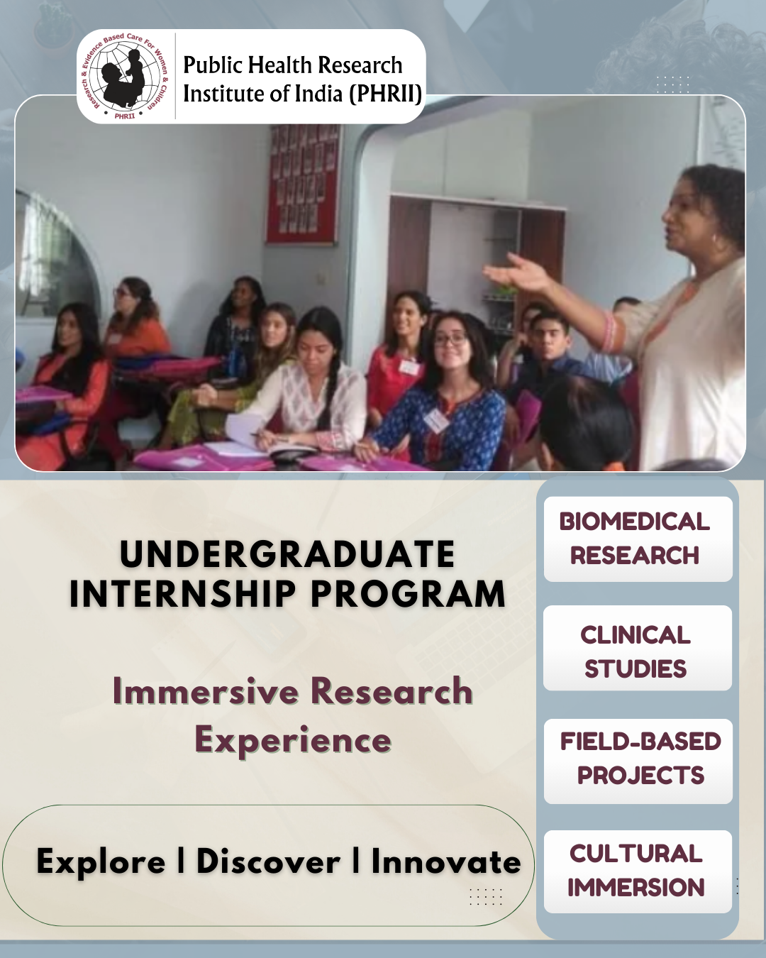 PHRII offers 12-week immersive research experience through our internship program for undergraduate students from India and across the globe. Interns may design innovative short-term projects for implementation or work on ongoing projects in biomedical research, clinical studies, and field-based public health. The program is available in virtual, in-person, and hybrid formats.