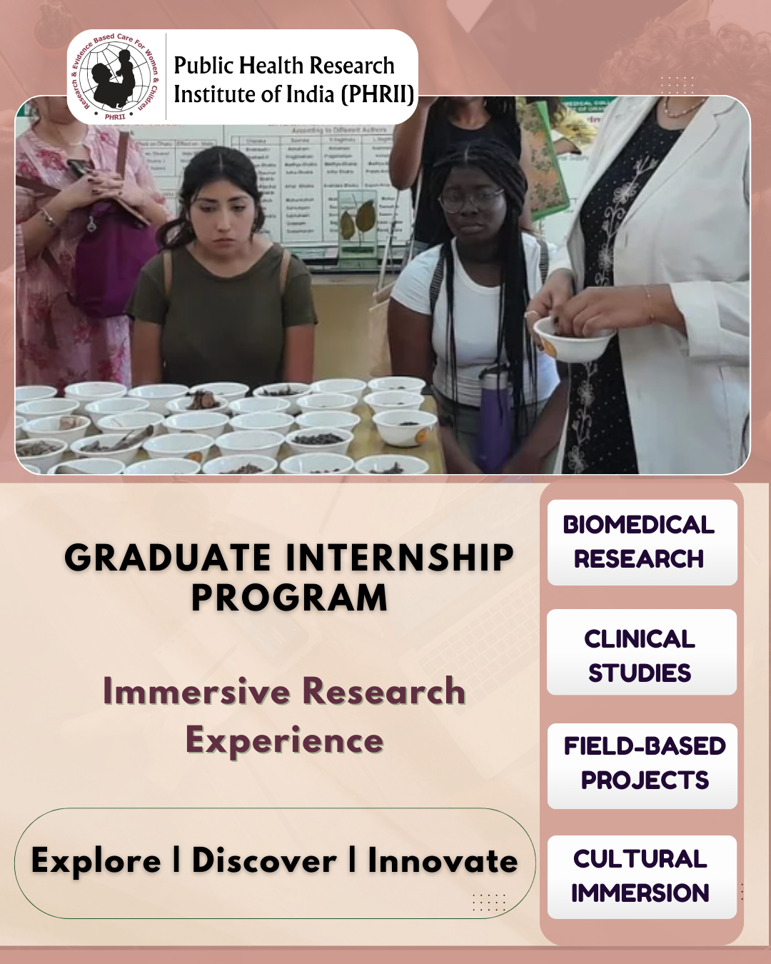 PHRII offers 12-week immersive research experience through our internship program for graduate students from across the globe. Interns may design innovative short-term projects or work on ongoing projects in biomedical research, clinical studies, and field-based public health. The program is available in virtual, in-person, and hybrid formats.